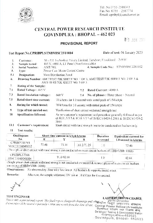 We at AM Technokrat Pvt Ltd has successfully passed 5 rigrous Type Tests at CPRI Laboratories also for LV Switchboards as: